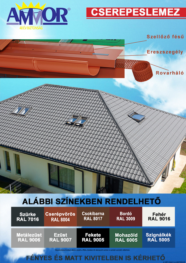 A cserepeslemez kiválóan alkalmas tetőfedésre, megjelenése illeszkedik a kor igényeihez, súlya csekély, szerelése gyors és egyszerű.